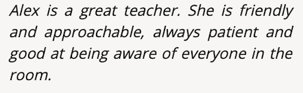 Please email me at alexandra_cross@hotmail.com for more information about my classes, payment and joining details.
